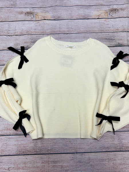 Elevate your everyday style with this charming bow sweater, designed to turn heads with its distinctive sleeve details. Delicate black bows cascade along each sleeve, adding a touch of playful sophistication to a cozy knit that feels as good as it looks. Available in rich wine and creamy ivory, this versatile piece transitions seamlessly from casual weekends to polished office days. The soft, comfortable fit makes it perfect for layering or wearing solo, while the thoughtful bow embellishment sets it apart from basic sweaters. Wrap yourself in warmth and personality—this is the sweater you'll reach for again and again.