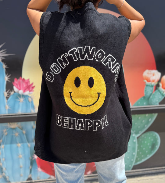 Stay comfortable and stylish with the "Don't Worry Be Happy" Vest. This oversized black vest features a large smiley face on the back and a smaller one on the front, radiating positive vibes wherever you go. Made from thick material, it offers warmth and a cozy fit perfect for layering. Embrace a joyful look that lifts both your mood and your outfit effortlessly.