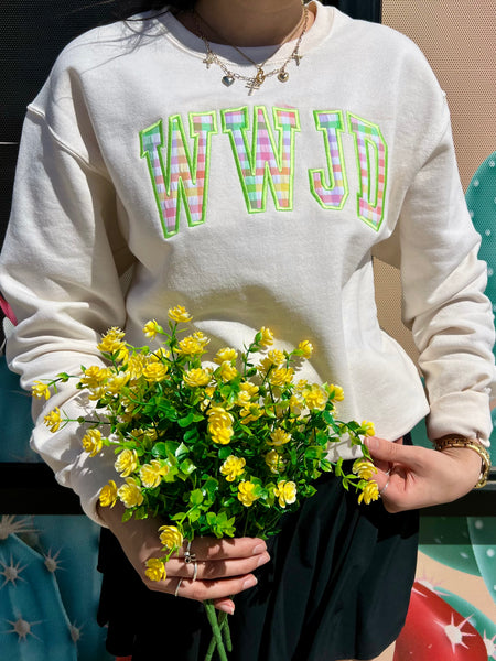 Timeless ivory crewneck sweater featuring embroidered "WWJD" lettering across the chest. Classic crew neckline and comfortable fit make it perfect for layering or wearing solo. The embroidered design adds a meaningful touch to your everyday wardrobe. Soft, versatile, and ideal for spring styling.
