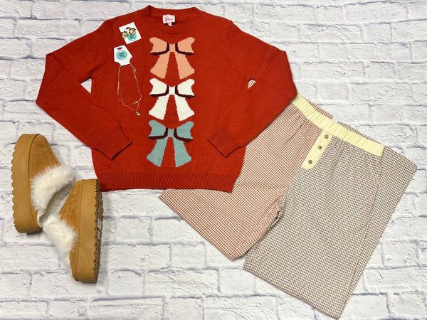 Stay cozy and stylish with the Triple Bow Knit pullover. This soft sweater features three charming bows in pink, white, and blue running down the center, beautifully contrasting the rich maroon-red fabric. Perfect for adding a touch of playful elegance to your casual wardrobe, it’s a comfortable choice for chilly days. Elevate your look with this unique and inviting knit.