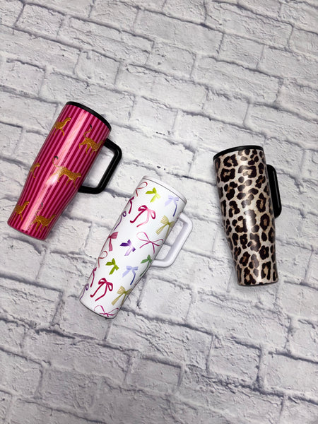 Stay hydrated in style with our eye-catching 40 oz tumblers, designed to match your personality. Choose from three stunning patterns: pink striped with leopards for a bold, playful look; classic leopard for timeless appeal; or crisp white adorned with colorful bows for a cheerful vibe. Each tumbler keeps your beverages at the perfect temperature while making a fashion statement. Whether you're heading to the gym, office, or weekend adventures, these versatile tumblers combine functionality with flair. Find your favorite design and make hydration fashionable.